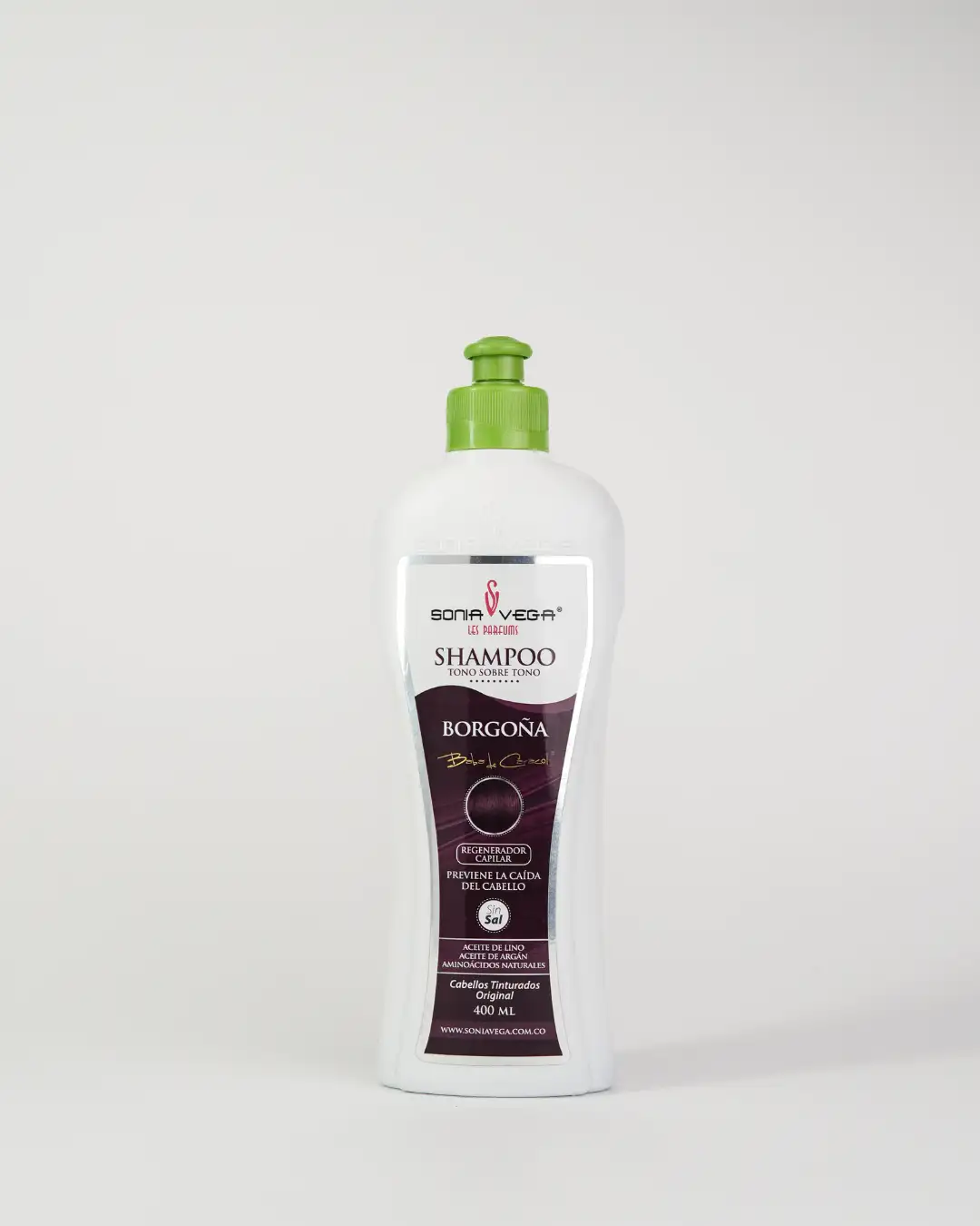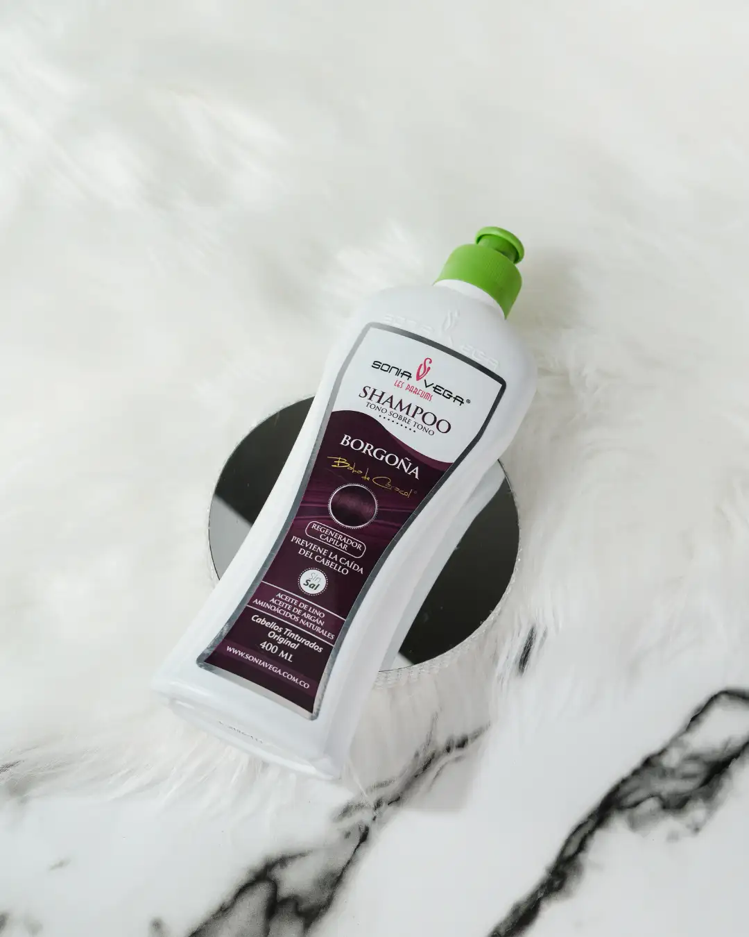 ¡Realza tu color con nuestro Shampoo Tono sobre Tono Borgoña SONIA VEGA LES PARFUMS®! Refresca tu cabello, aporta brillo y un tono borgoña intenso y duradero.