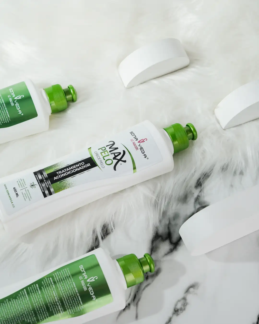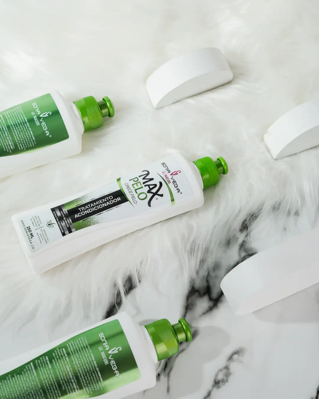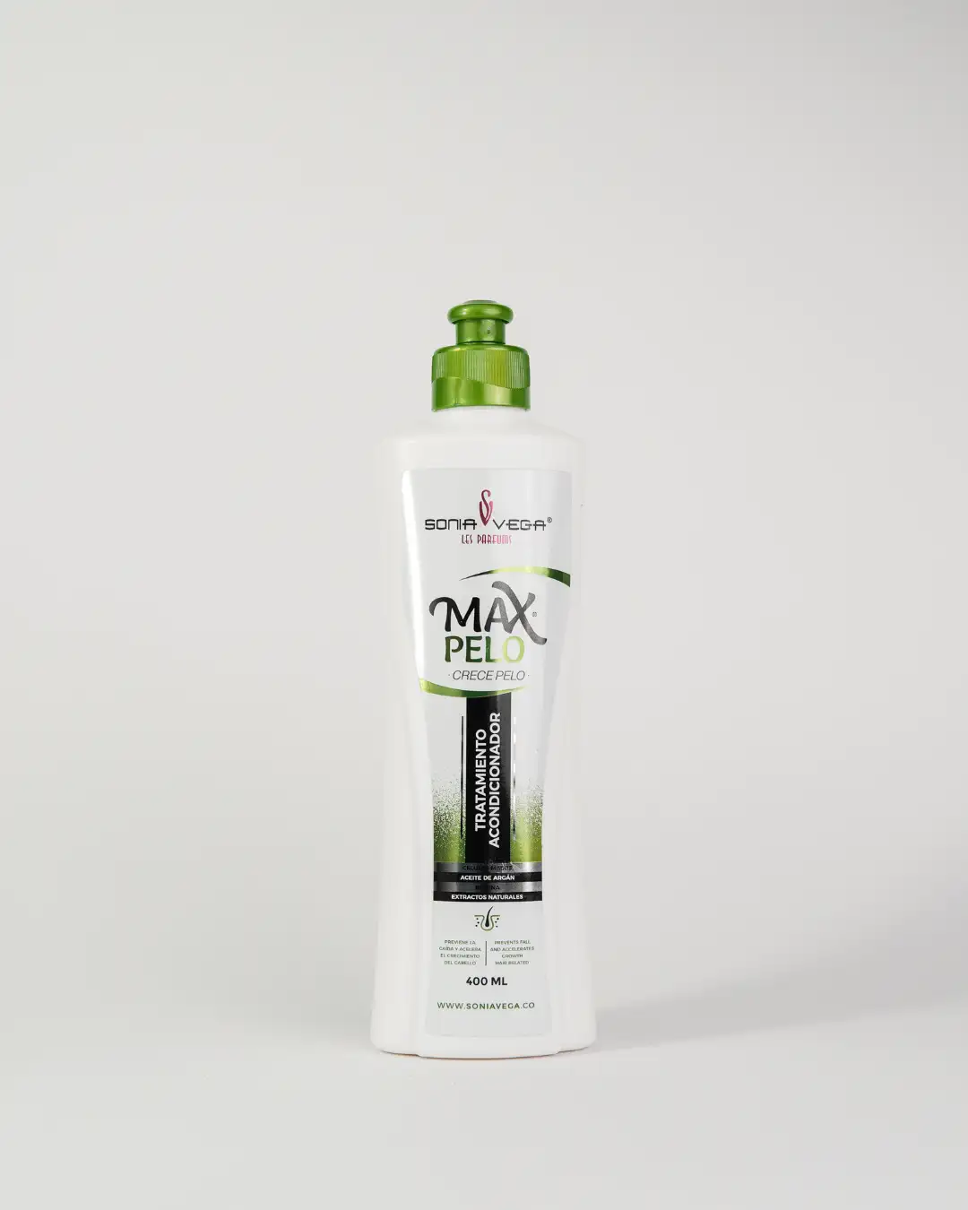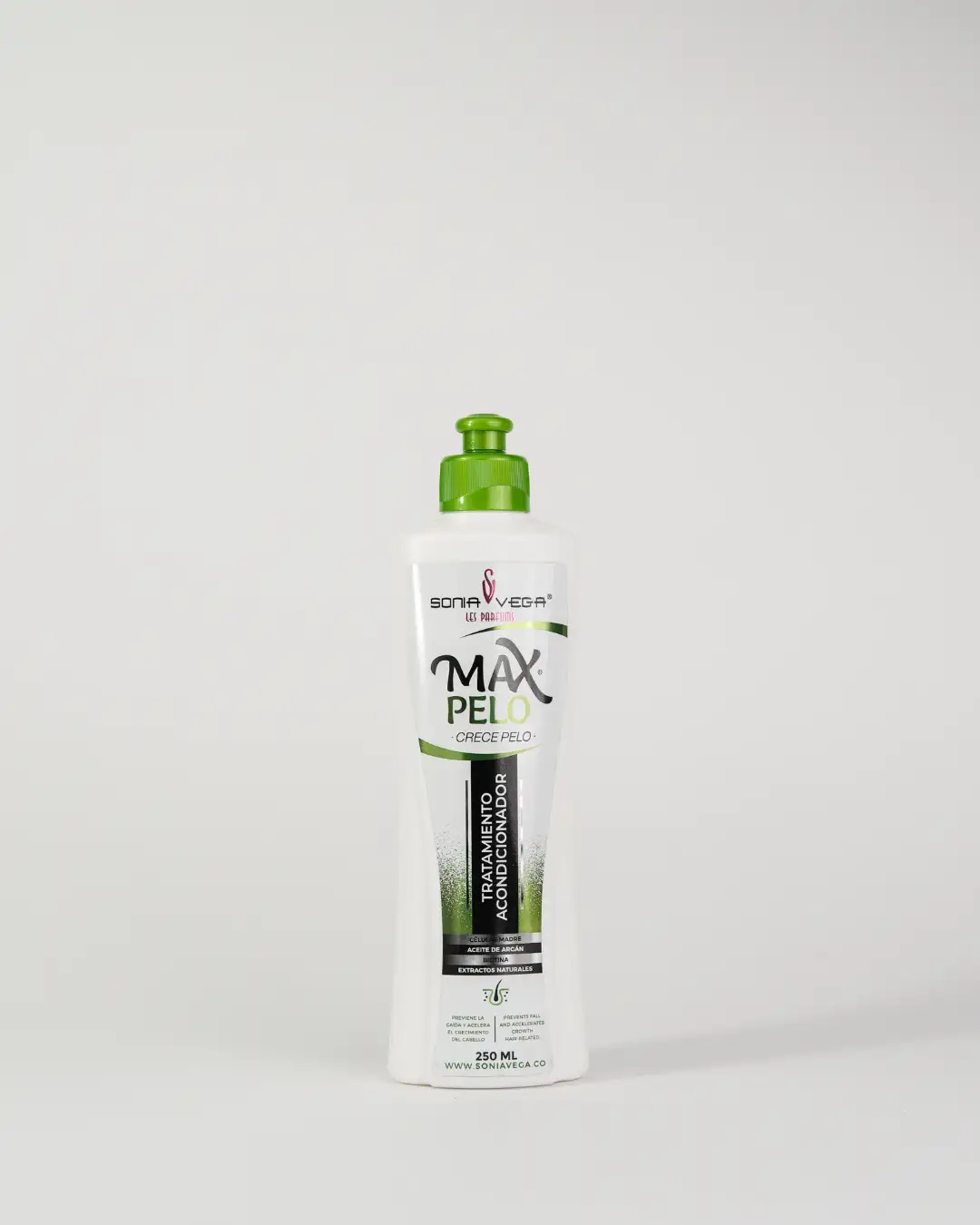 El Tratamiento Acondicionador Max Pelo SONIA VEGA LES PARFUMS® está formulado con células madre, aceite de argán y biotina, además de extractos naturales de romero, caléndula, aloe vera, ortiga, árnica y manzanilla. Estos ingredientes actúan directamente en el folículo piloso, fortaleciendo el cabello y ayudando a reducir la caída excesiva. Por otro lado, su fórmula nutre, repara y revitaliza los cabellos débiles, estimulando un crecimiento fuerte y constante. El uso regular de este tratamiento deja el cabello más denso, saludable y con mayor vitalidad. Para potenciar sus resultados, úsalo junto con el Shampoo Max Pelo SONIA VEGA LES PARFUMS®.
